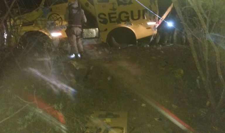 Veiculo ficou completamente destruído com a explosão. Um vigilante acabou ferido ao ficar preso nas ferragens.